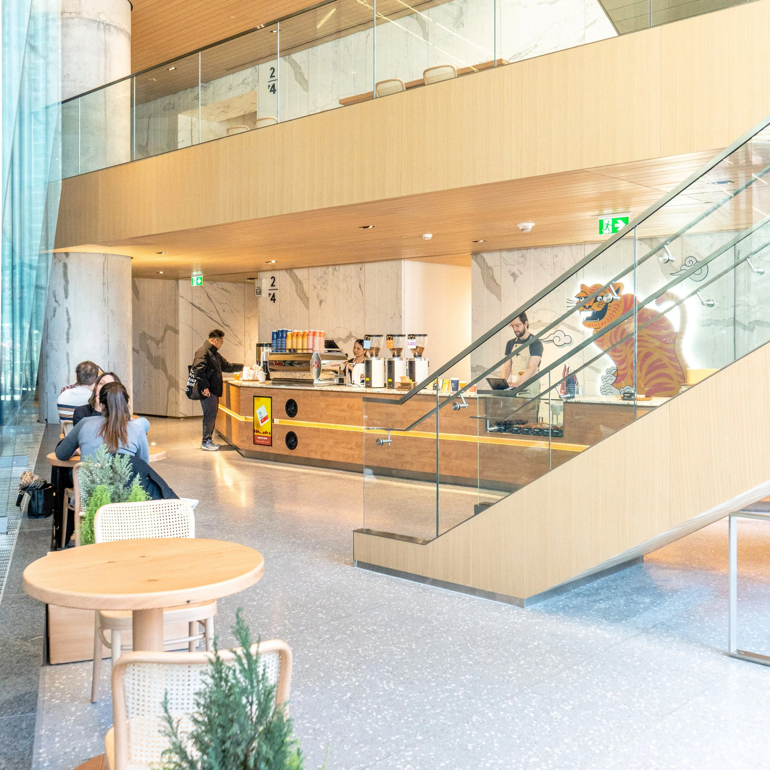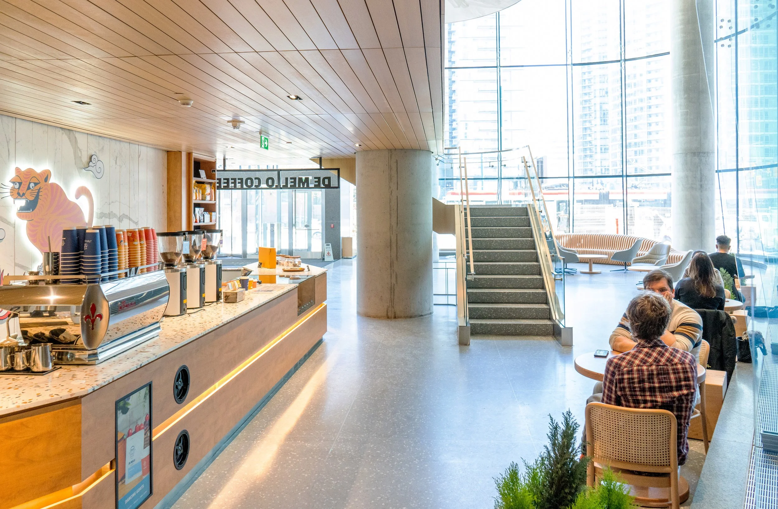 Our goal in designing this café was to create a welcoming and inspiring space that fosters a sense of relaxation, creativity, and positivity for our customers. We wanted to provide a social hub where people could come together to enjoy coffee, art, and community in a modern and bright atmosphere that feels connected to nature. Ultimately, we aimed to create an environment that promotes learning, gathering, and community building.