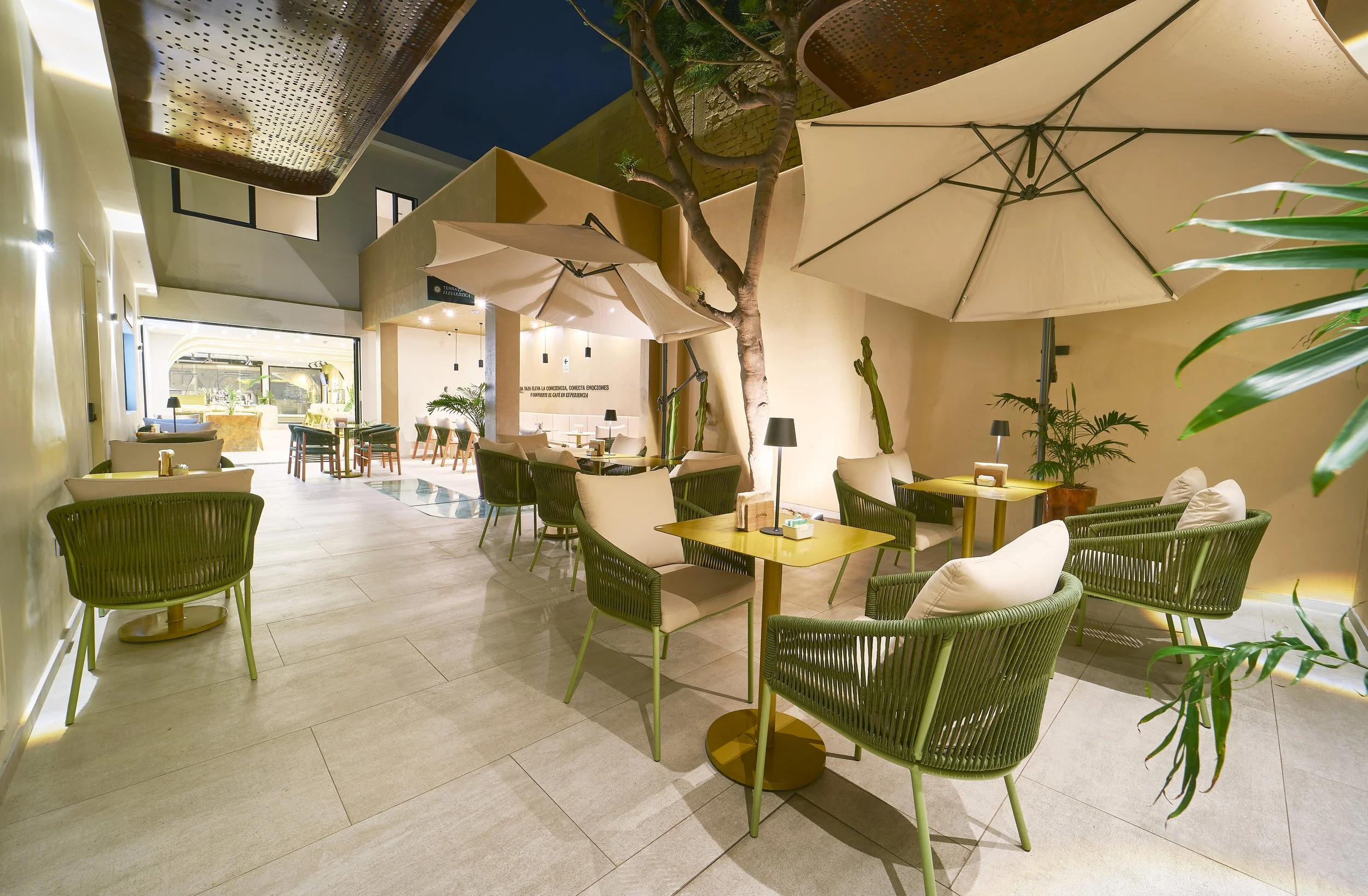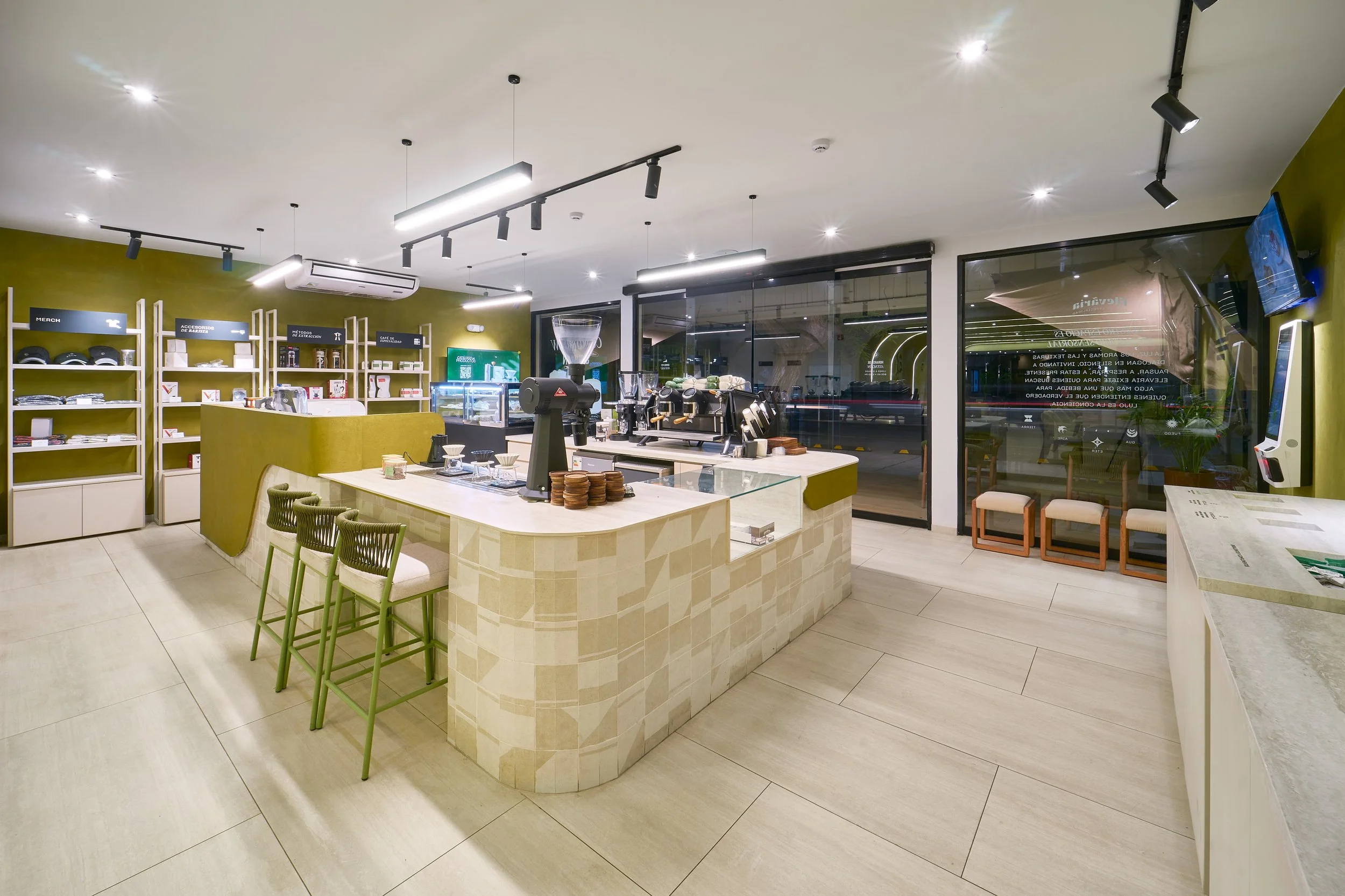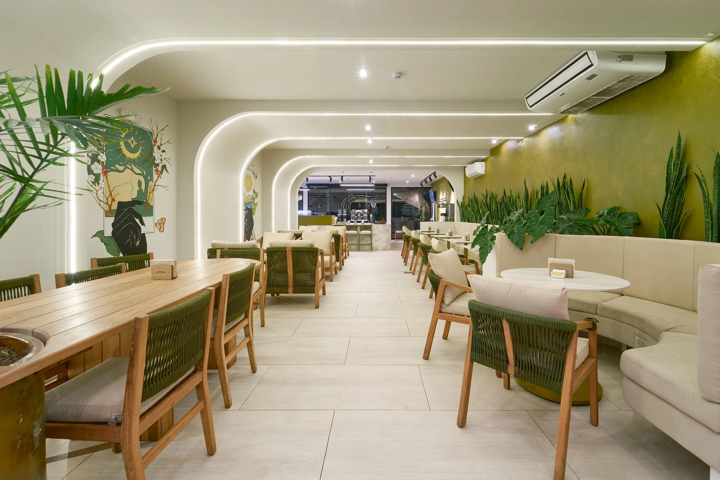 The design draws inspiration from the landscapes where coffee is grown. Natural materials, earthy tones, and the integration of vegetation reference the coffee plant and its environment. Olive green hues evoke coffee leaves, while neutral mineral colors reflect soil and natural textures. These elements create a calm and grounded atmosphere that contrasts with the fast pace of the city.