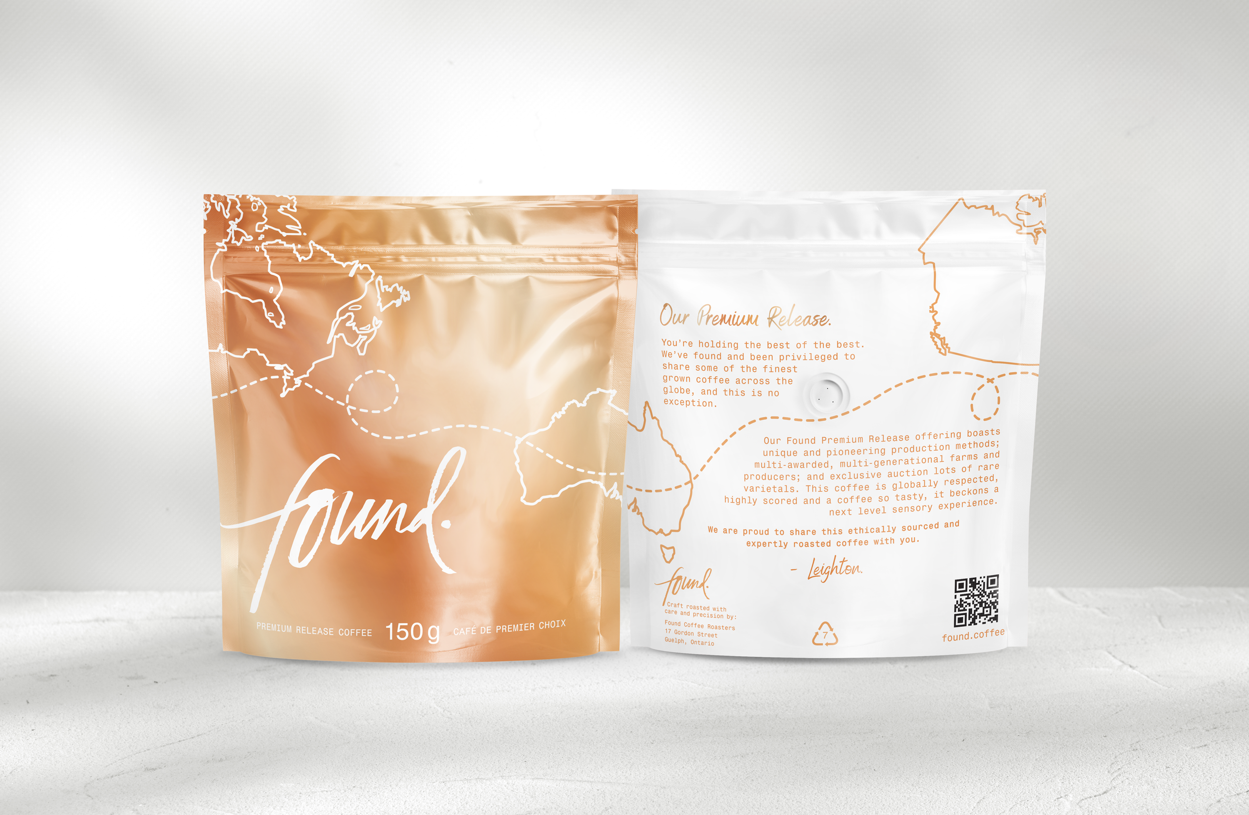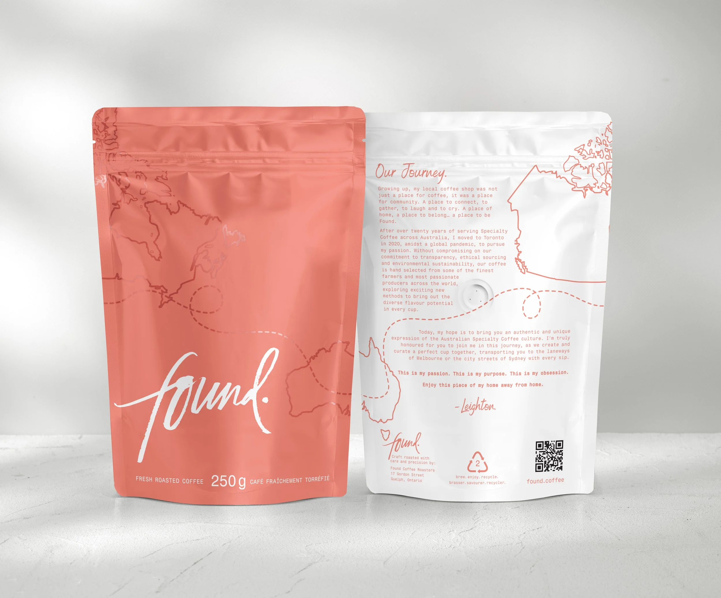 The story of Found Coffee was a love story from Australia to Canada and beyond, our branding and packaging's goal was to highlight the connected nature of our lives and our communities, and for our guests and customers to take their next step in their story. With each bag acting like a piece of the puzzle, our design connects with the front and back of the individual bag, but also connects to the next bag and last bag enjoyed, from our Blue Blend bags, or our Coral Single Origin bags, or our Premium White and Gold bags, all connect to the next to encourage coffee lovers to continue their journey of discovering specialty coffee.