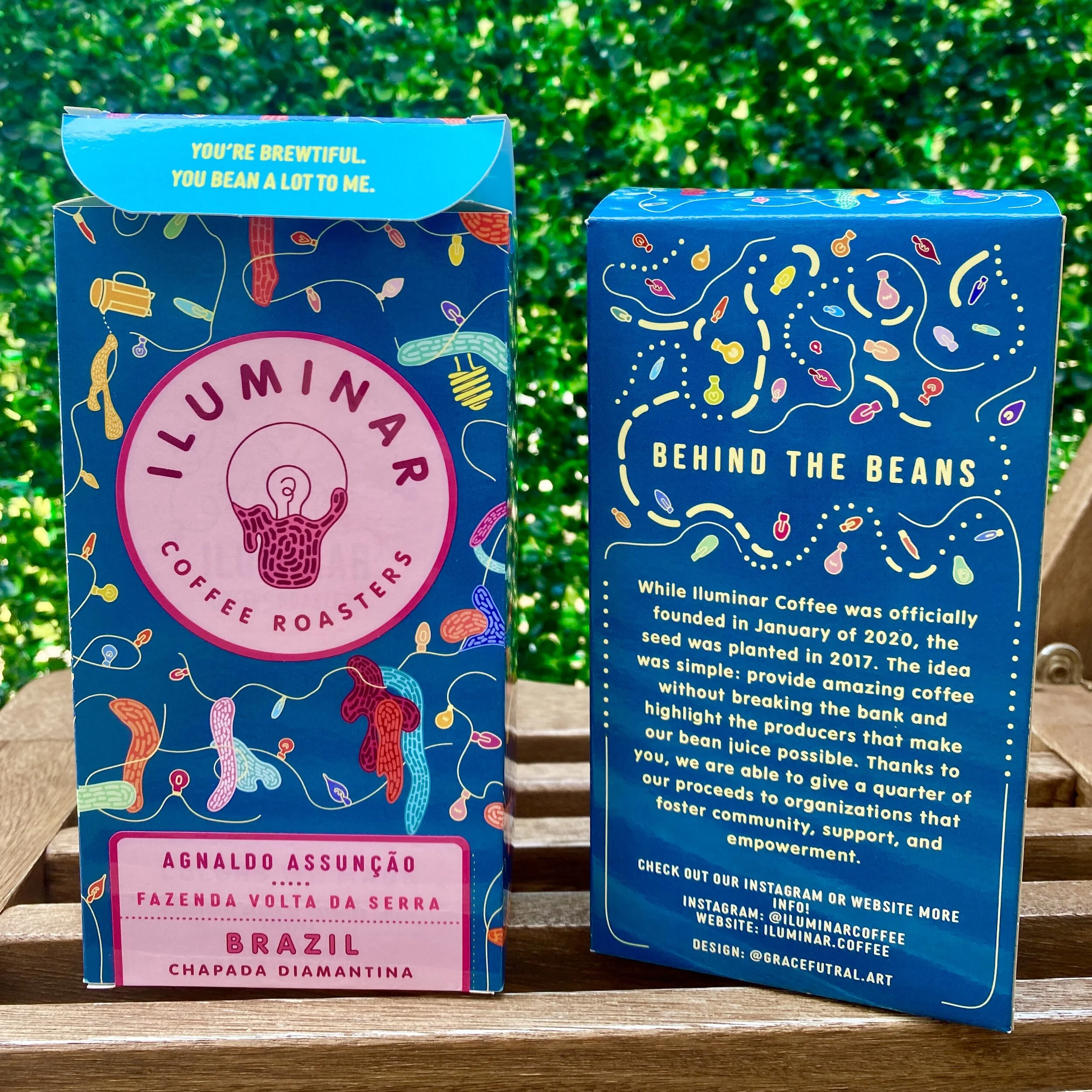 The design came from the conjunction of our brand name and the coffee it sources. The background features lights blended with textured drips of color to create an environment of vibrant, dynamic chaos. The box design both physically and schematically allows space for labels that unify iluminar with the details of the corresponding coffee. The intensity of the background is intended to bring our focus to the labels. Their visual simplicity but informational detail maximize the attention paid to the specificity of each coffee. In congruence, the geography and the producers/farmers appear at the front of the box along side our company name. As roasters, Iluminar Coffee understands its job to be one that illuminates, rather than introduces the characteristics of each bean. This, our packaging is intentionally reflects the ethos of our company.