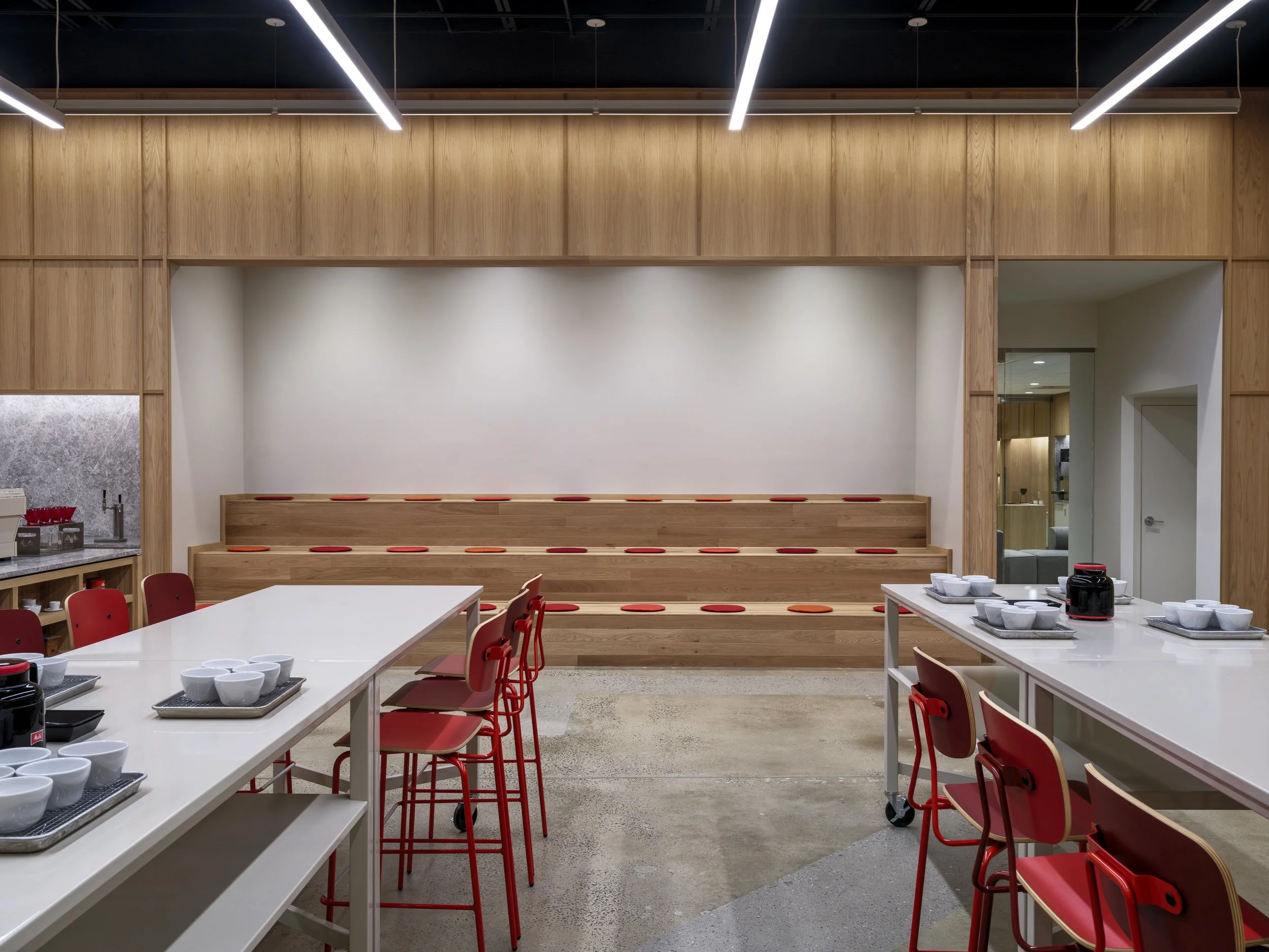 In 1908, Melitta Benz revolutionized coffee when she invented the pour-over and filter system in her kitchen. M-LAB, located in Melitta North America’s roasting headquarters, re-imagines her kitchen as a modern innovation hub. The design functions as a high-performance ecosystem, serving as a business accelerator, innovation center, and community / industry education and engagement hub. The design is defined by interlocking wooden spaces that house the hub’s core functions. The M-LAB Arena is the central forum for collaboration featuring stadium seating, custom modular cupping tables, and a variety of commercial coffee preparation equipment. Surrounding this core are specialized zones, including the Green Coffee Lab, espresso bar, lounges, and conference spaces.
