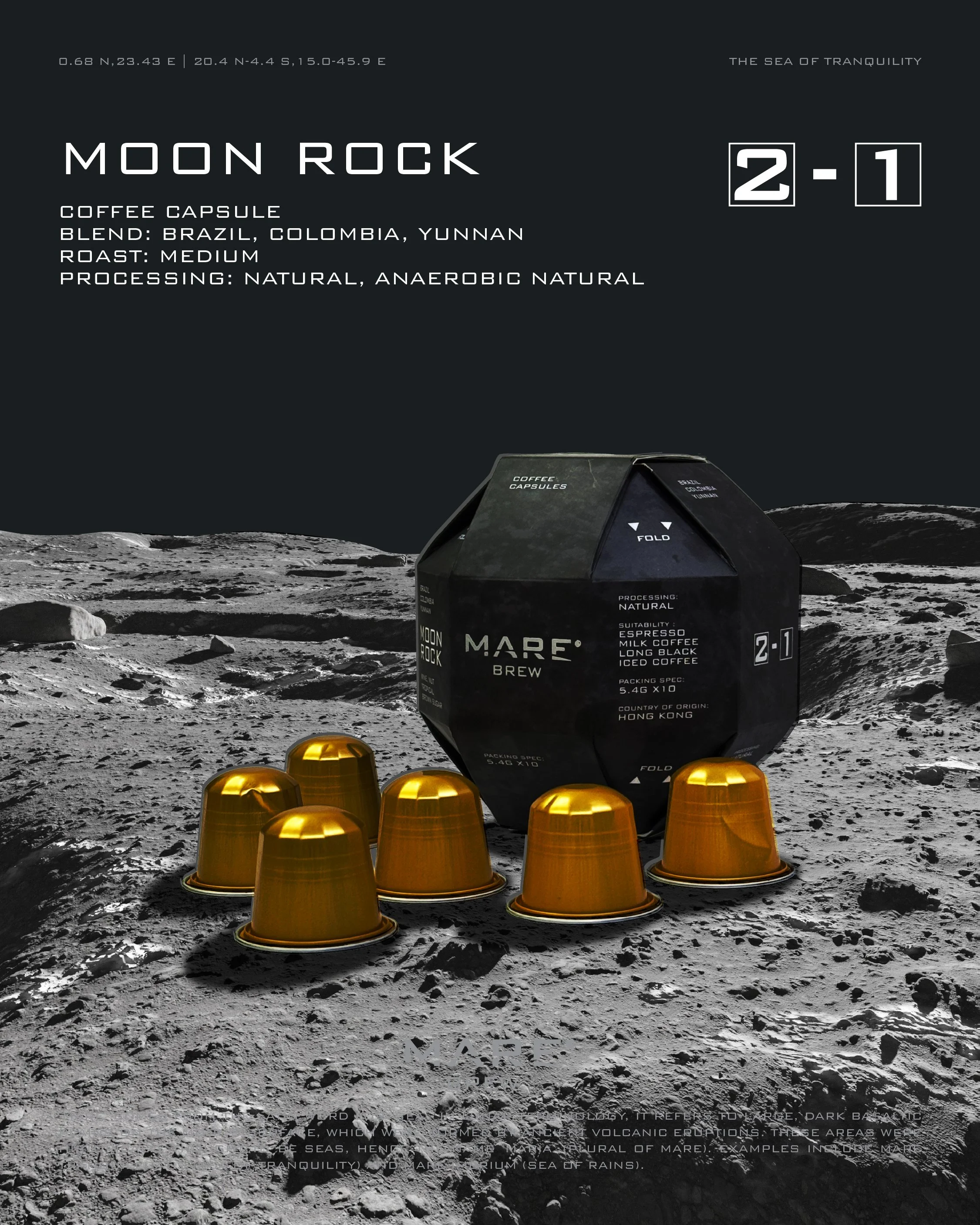 We set out to achieve one thing: to make the consumer feel like they are holding a piece of the Moon. The design transforms the daily ritual of making coffee into a moment of exploration and wonder. We wanted the packaging to be impossible to ignore on the shelf—striking, architectural, and utterly unfamiliar. By treating the coffee capsule as a lunar sample, we elevate the product from a consumable to an artifact. The goal was to create a physical bridge between our brand philosophy—"Not because it is easy, but because it is impossible"—and the hands of the consumer. When you hold the MOON ROCK box, you should feel the weight of that ambition.