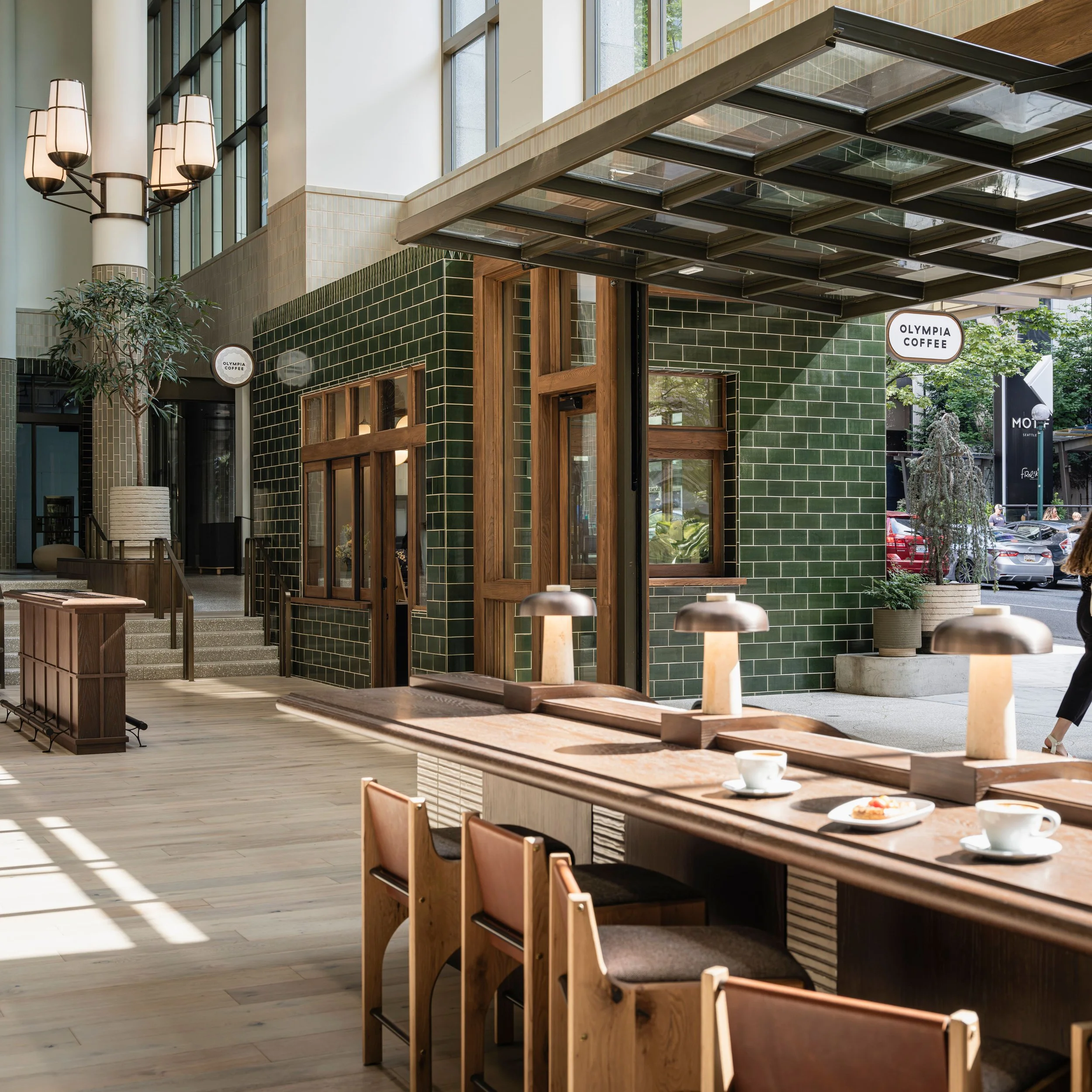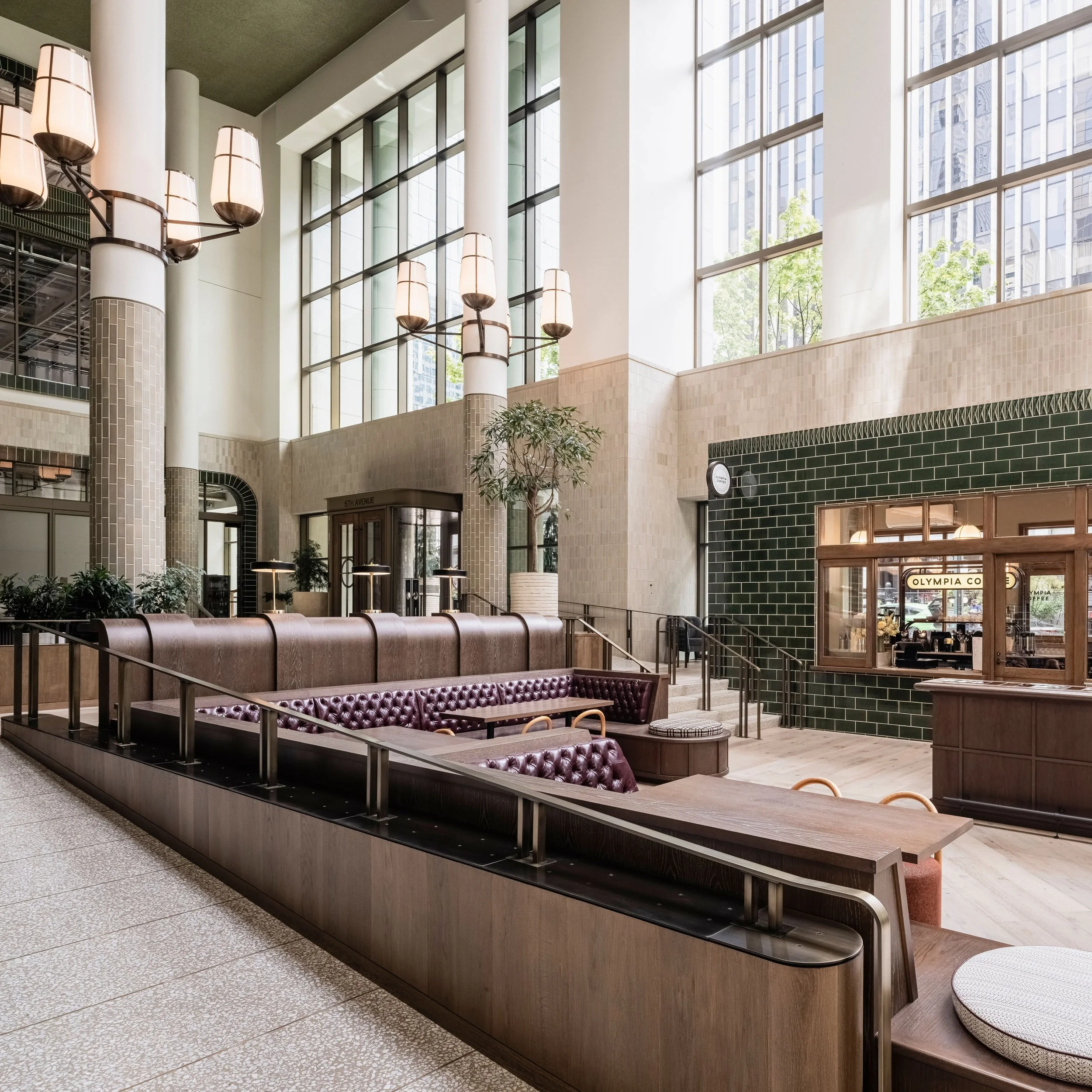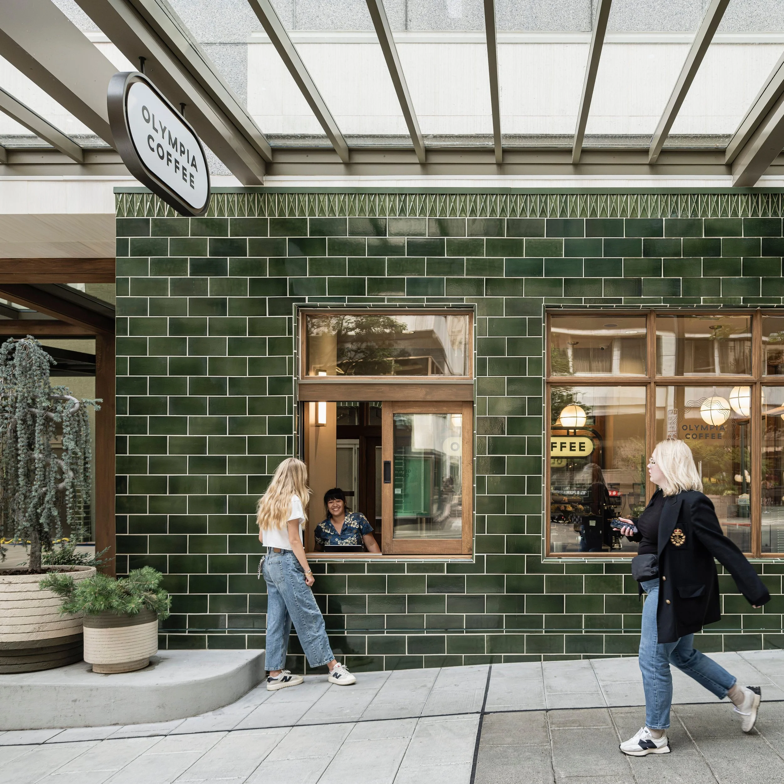 Positioned inside the revitalized Cedar Hall atrium of the U.S. Bank Center, Olympia Coffee’s newest location in Downtown Seattle brings thoughtful hospitality to the architectural forefront. Framed by arched windows, tiled walls, and plush seating, the cafe sits within a luminous lobby space designed for both movement and pause, complete with convertible doors that blur the line between indoor and out.
