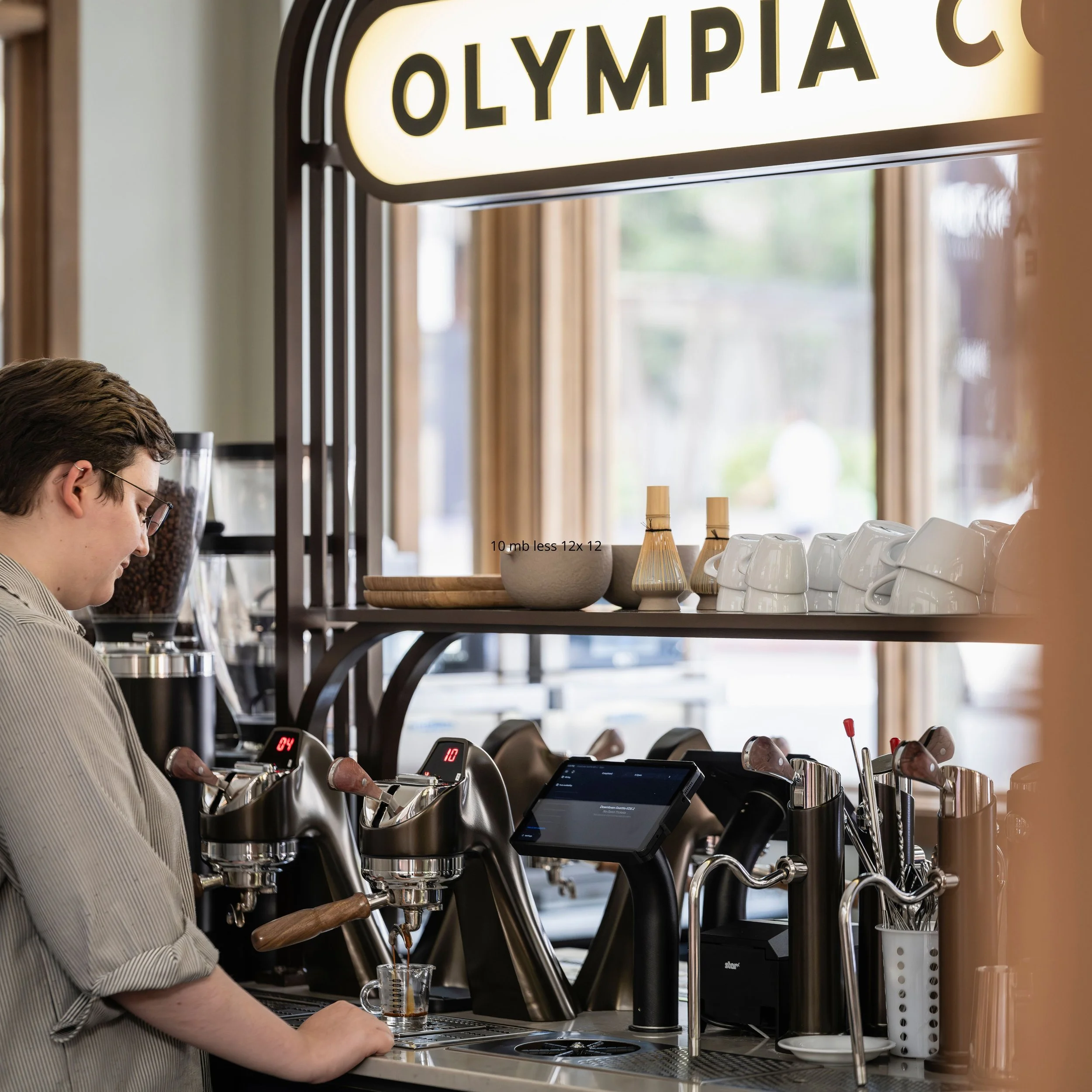 As a certified B Corporation, Olympia Coffee’s values show up in every detail, from the minimized equipment footprint and sustainable material choices, to its integration within the LEED Gold-certified building, where guests enjoy amenities like EV charging, on-site composting, and a rooftop apiary.
