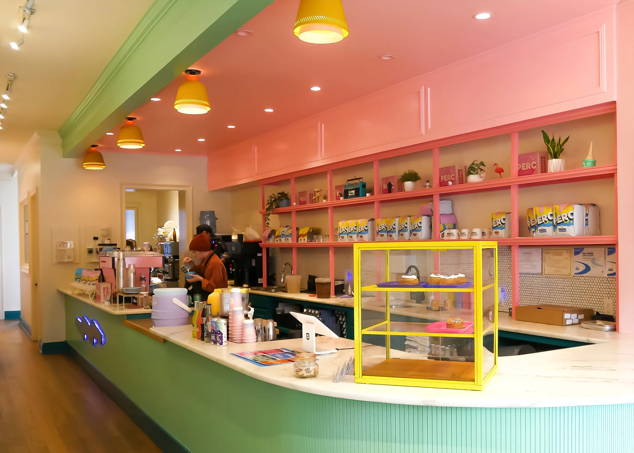 We wanted to create a space that felt inviting and approachable to everyone, from the craft coffee curious to the seasoned enthusiast, as well as the casual daily drinker. The design reflects PERC’s playful and energetic brand, using bold color, clear layout, and welcoming seating to make the experience feel easy and fun rather than intimidating. By combining bright visual elements with comfortable gathering spaces, the shop encourages people to explore coffee, spend time with friends, and feel like part of the neighborhood.