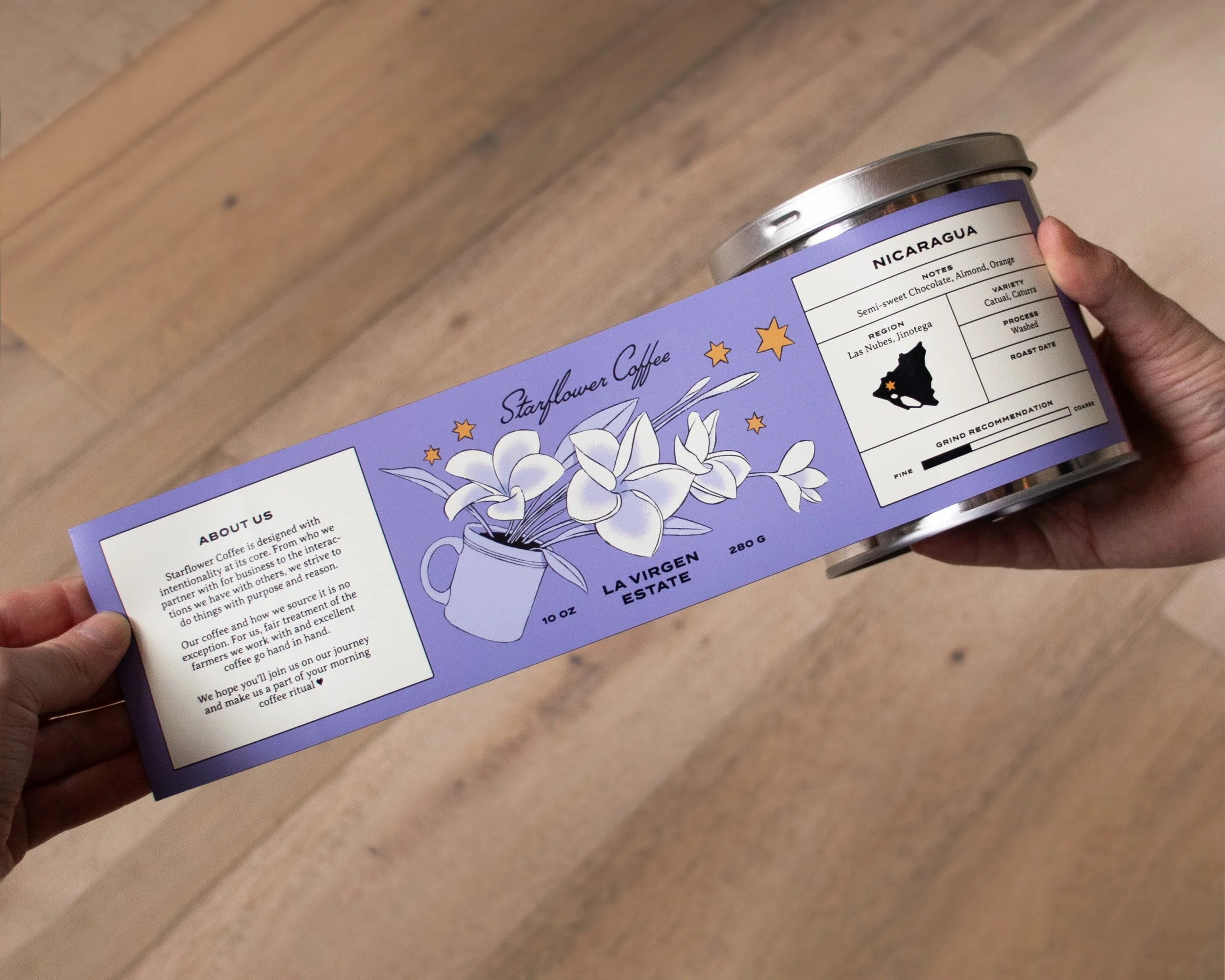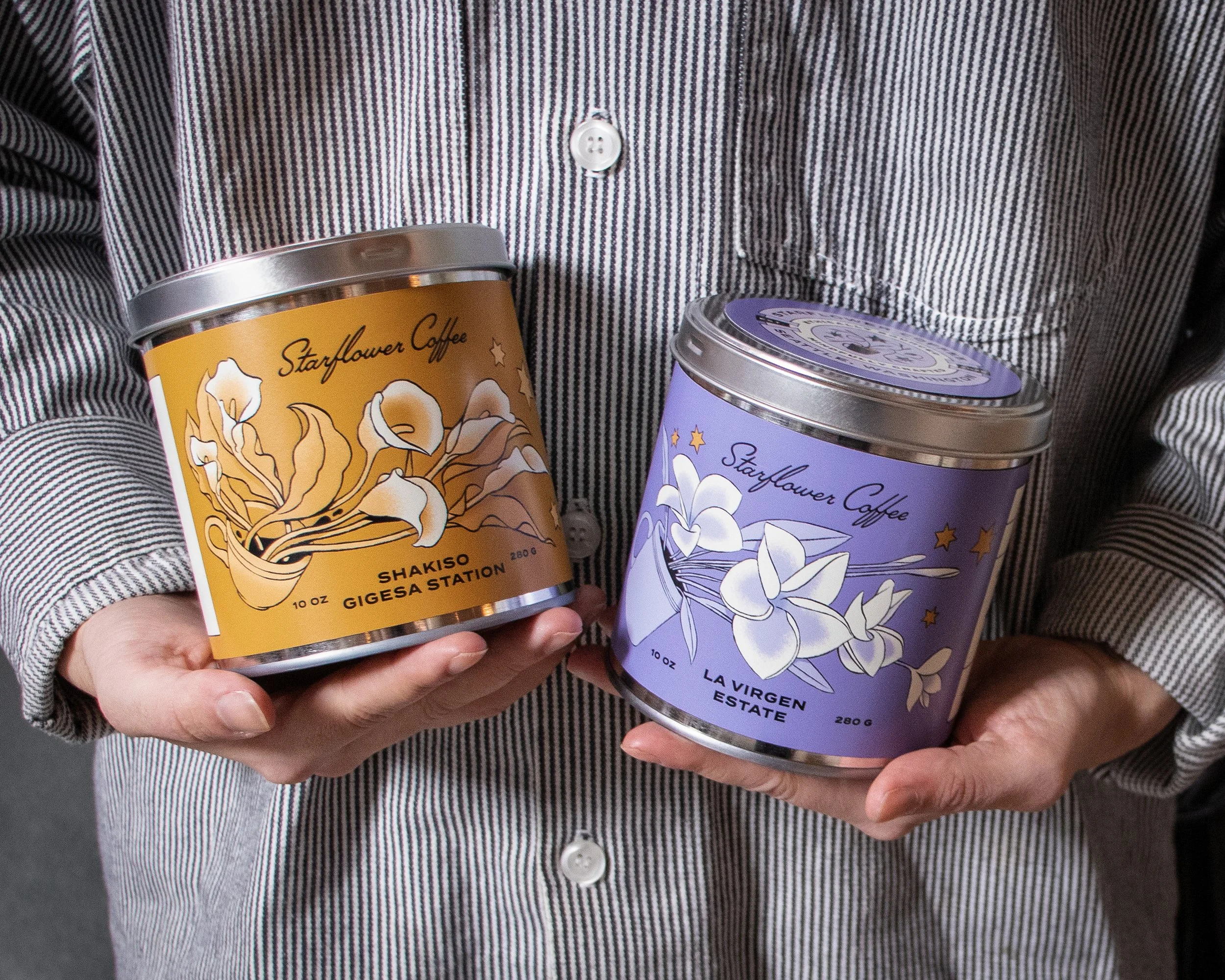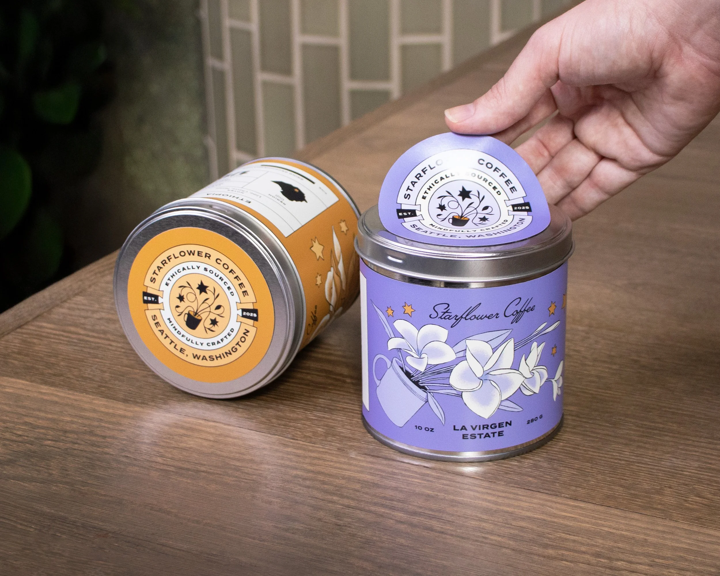 The goal of the design is to foster an environment of community and care. A key word for Starflower Coffee is ‘magic.’ The joy of community, the work and soul of the many hands that go into creating a cup of coffee from a cherry seed. Care for the planet is central to the decision making process. Reusability, and reduction of plastic waste are the main factors that shape our packaging. We want to evoke the comfort and love of a product we are so used to consuming to create a meaningful and mindful experience. We took an intentional step away from the sterility that defines so much of modern design with illustrations, colors, and typography that feel as wholly magical as they do distinctly human.