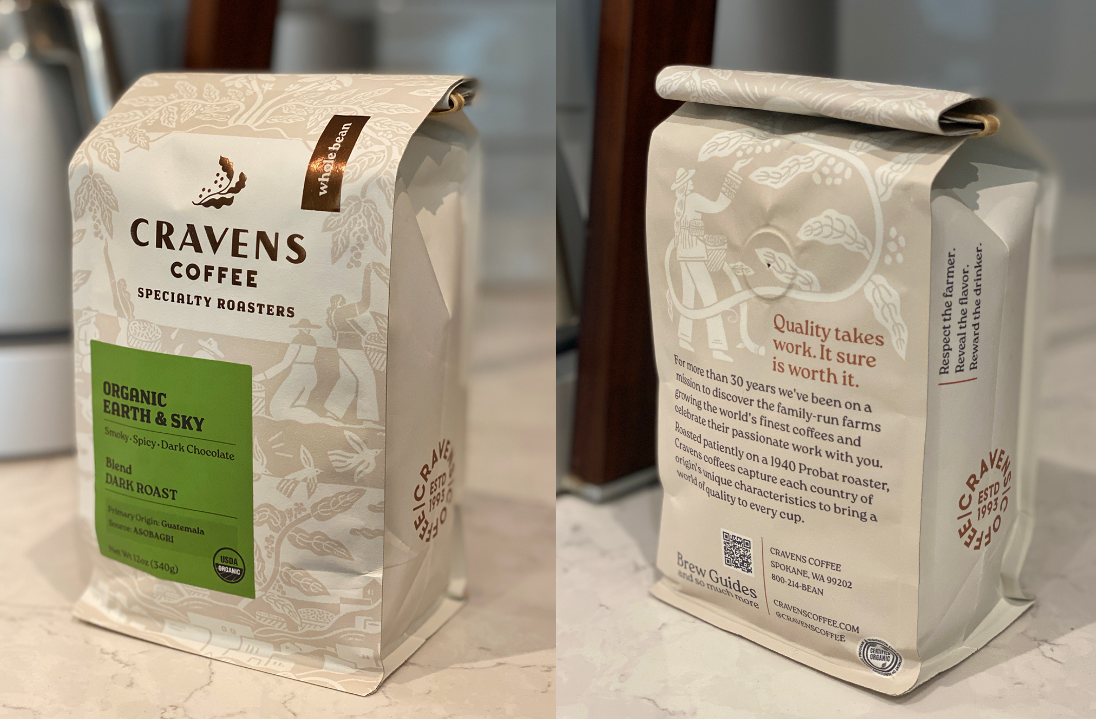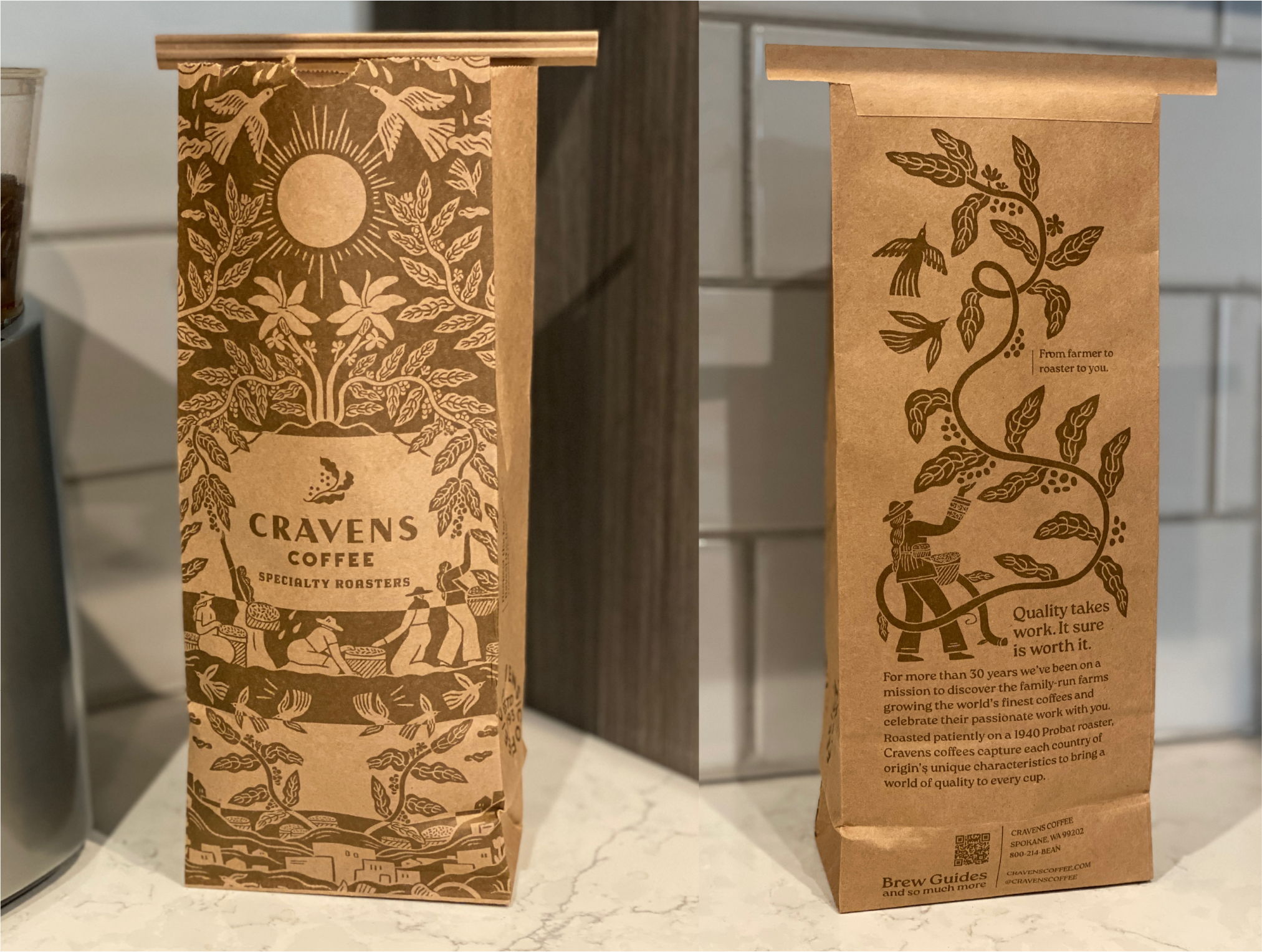 We chose bags made from sustainable Kraft paper in both white, for ink legibility on the primary bags, and Kraft color, for the to-go secondary bags. We chose the matte, rustic look to emphasize Cravens core messaging that celebrates their coffee farmers. The configuration is a block bottom bag that gives us a stand-up pouch with gusseted sides which sits narrow on the shelf, and doesn't tip over.