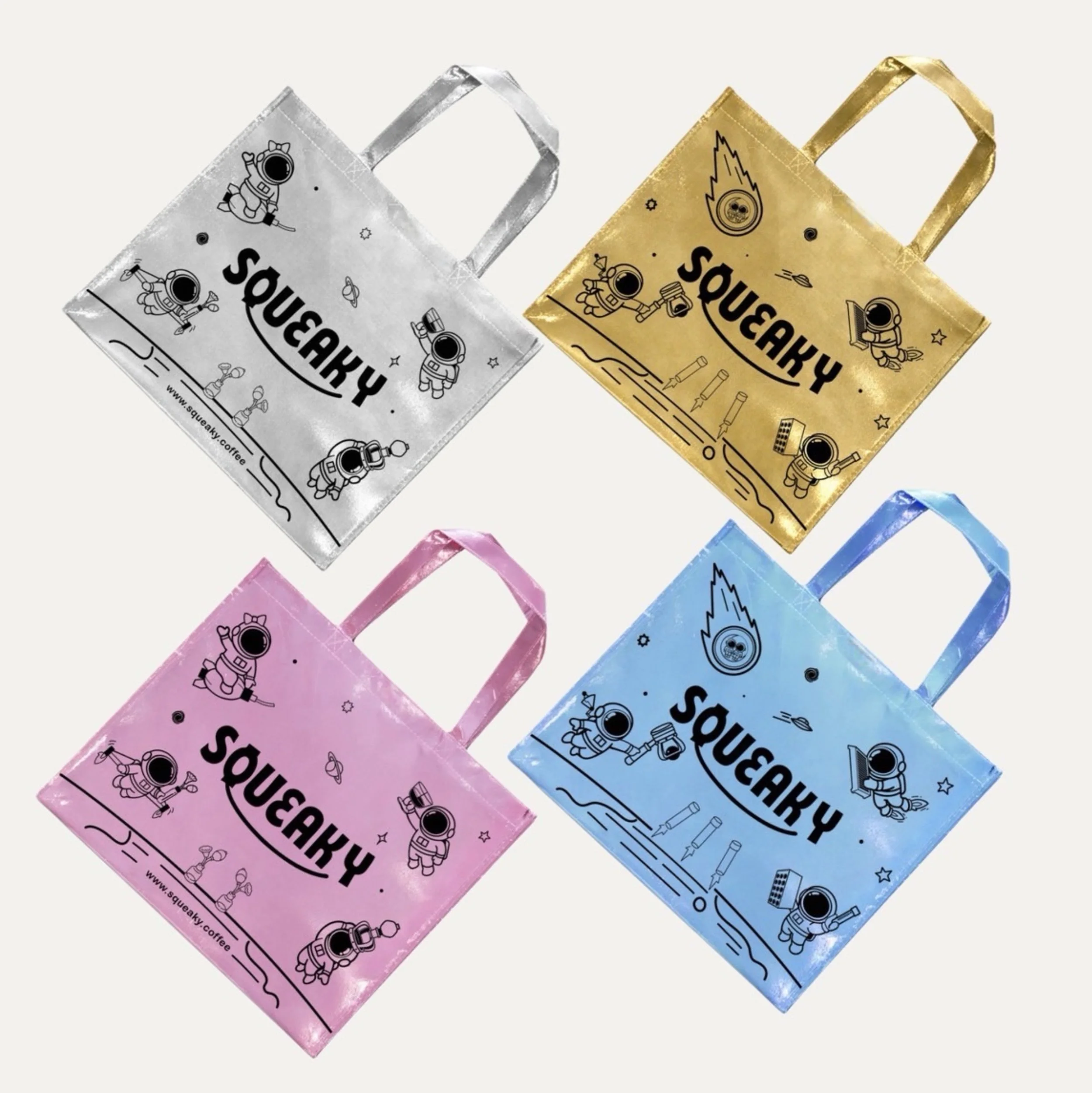 The metallic material and bold color variations (gold, silver, blue, and pink) were chosen to create a distinctive visual presence while also making the bag recognizable as part of the Squeaky universe.