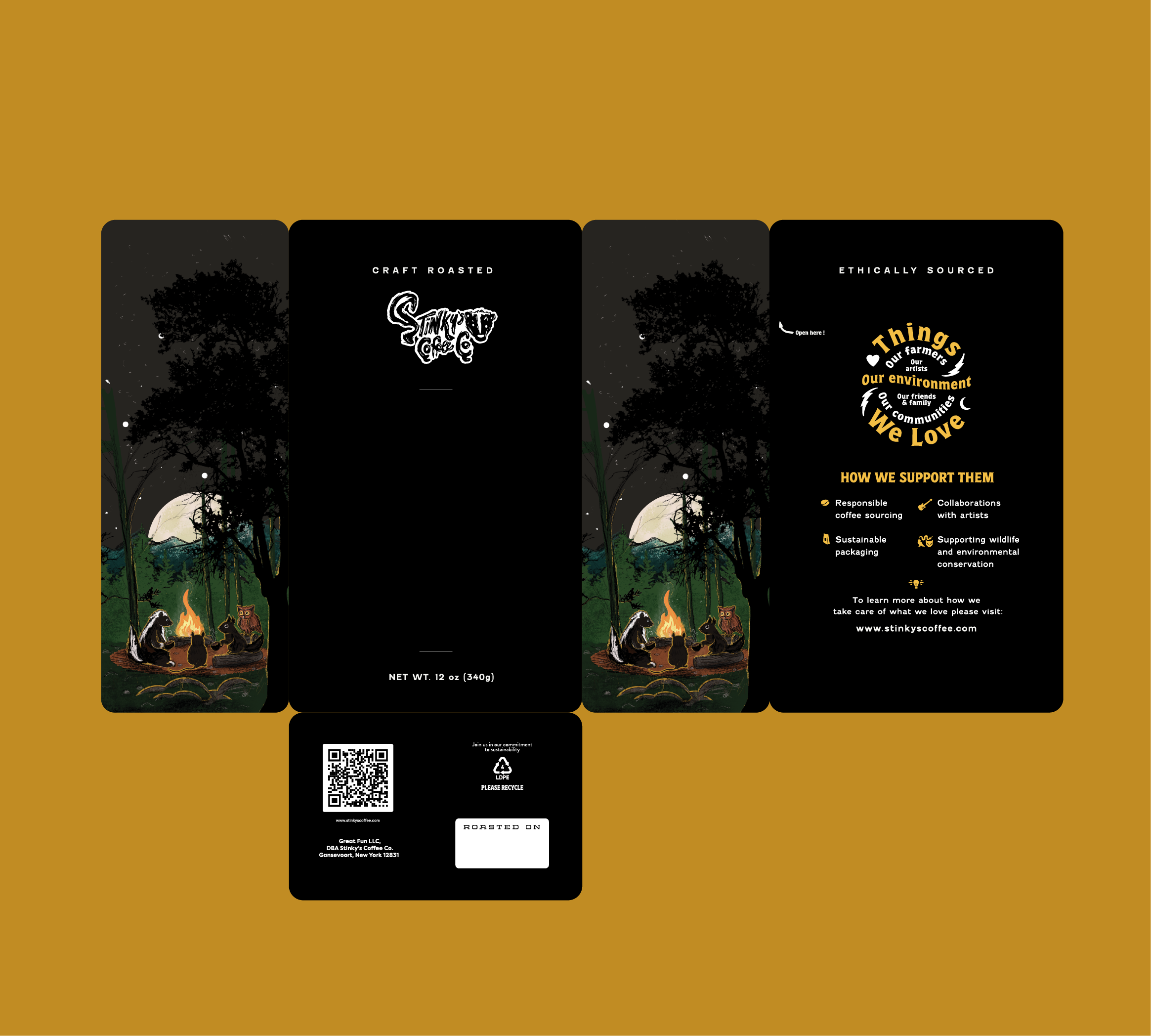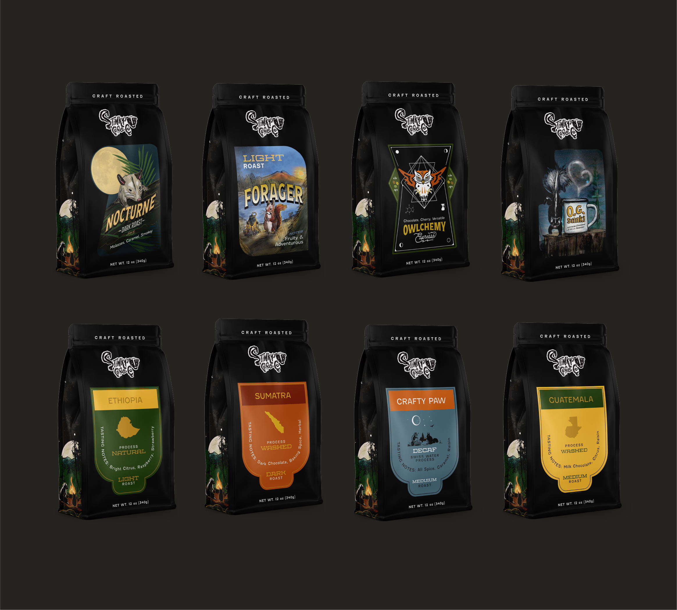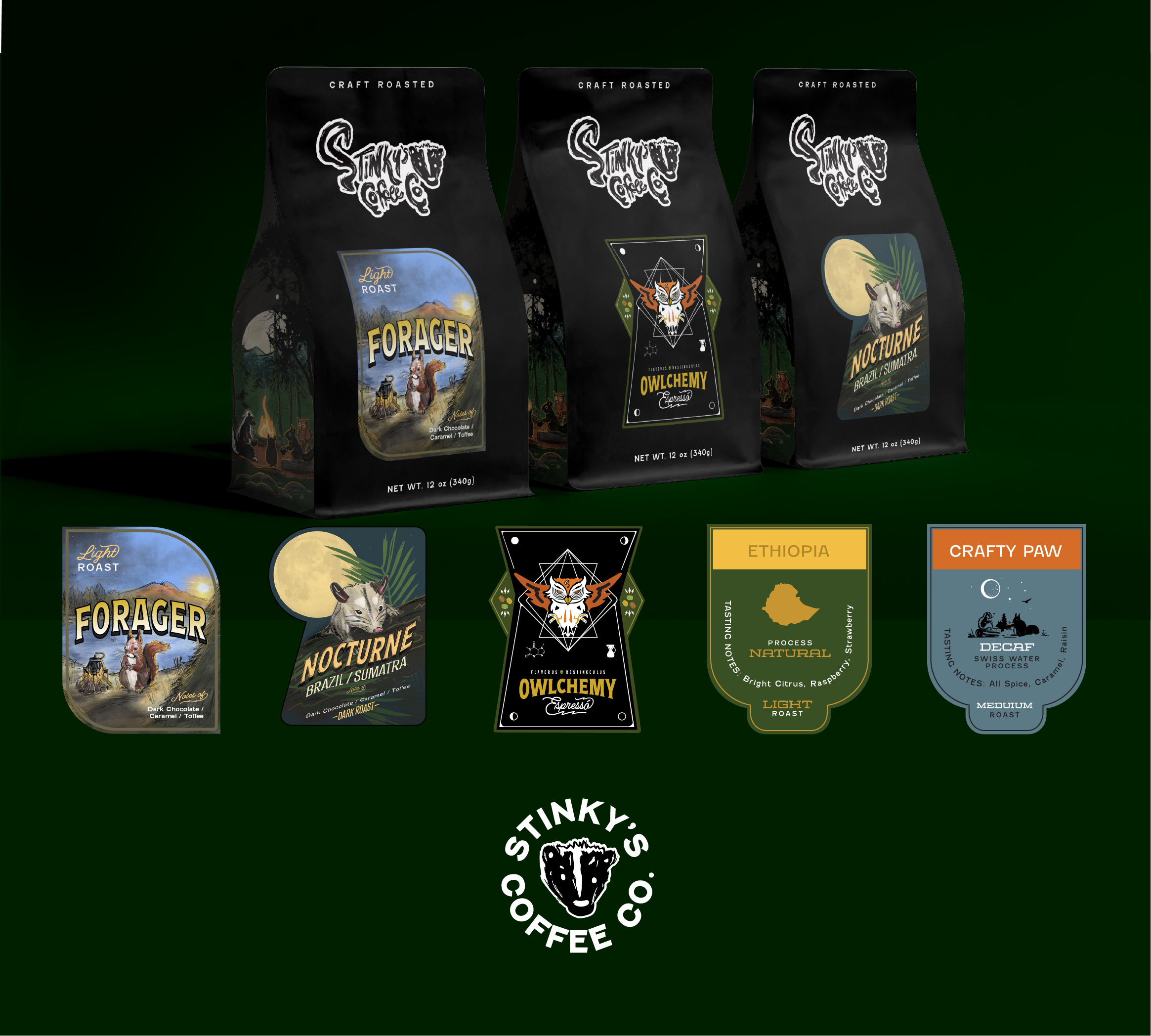 Stinky's Coffee Co. is a self-taught, one-person roastery built from scratch in upstate New York, on the edge of the Adirondack Mountains. The packaging was designed to carry that spirit of place and wildness.