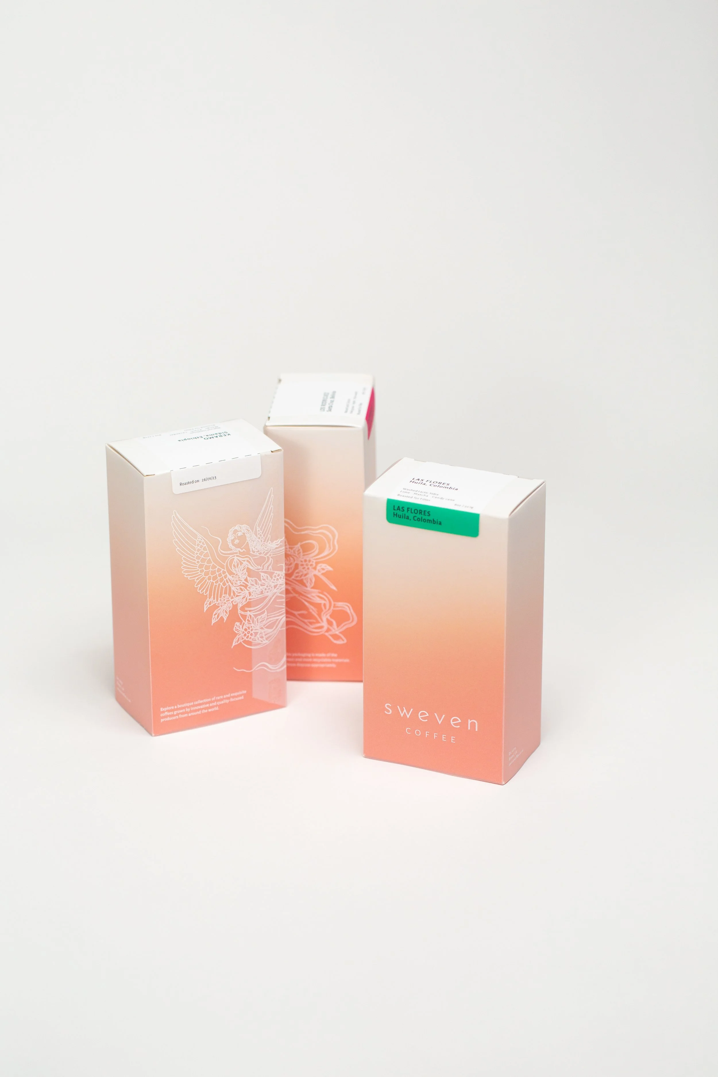 We have worked with the talented Angel & Anchor from Belfast, Northern Ireland, alongside team of paper smiths, printing and packaging companies to create a unique concept that represents our brand and vision. A silk lightweight gradient box that blends from bright orange to white,coated with Transclear paper sleeve stamped with white foil. The gradient box creates contrast and depth whilst the Transclear paper adds calm and dreamy appearance as well as soft and superior tactile experience. The white foil stamp adds premium and minimalistic look with just the right amount of soft coral pink gradience against our logo and Angel to the front and back/side. For the labels we have picked soft tones of colours to compliment the overall visual appearance as well as clearly divide each separate coffee we release. We added to the label just the right amount of information by also including roast profile and the three most prominent tasting notes for ease of choice and consumer’s convenience. The silk box and the Transclear paper are both biodegradable and recyclable FCS & ECF certified. The bag inside is plastic zip free and recyclable. Just simply tear the top gently, weigh the beans you need, fold and place back in the box and finally dispose packaging appropriately after you finish in any household bin.