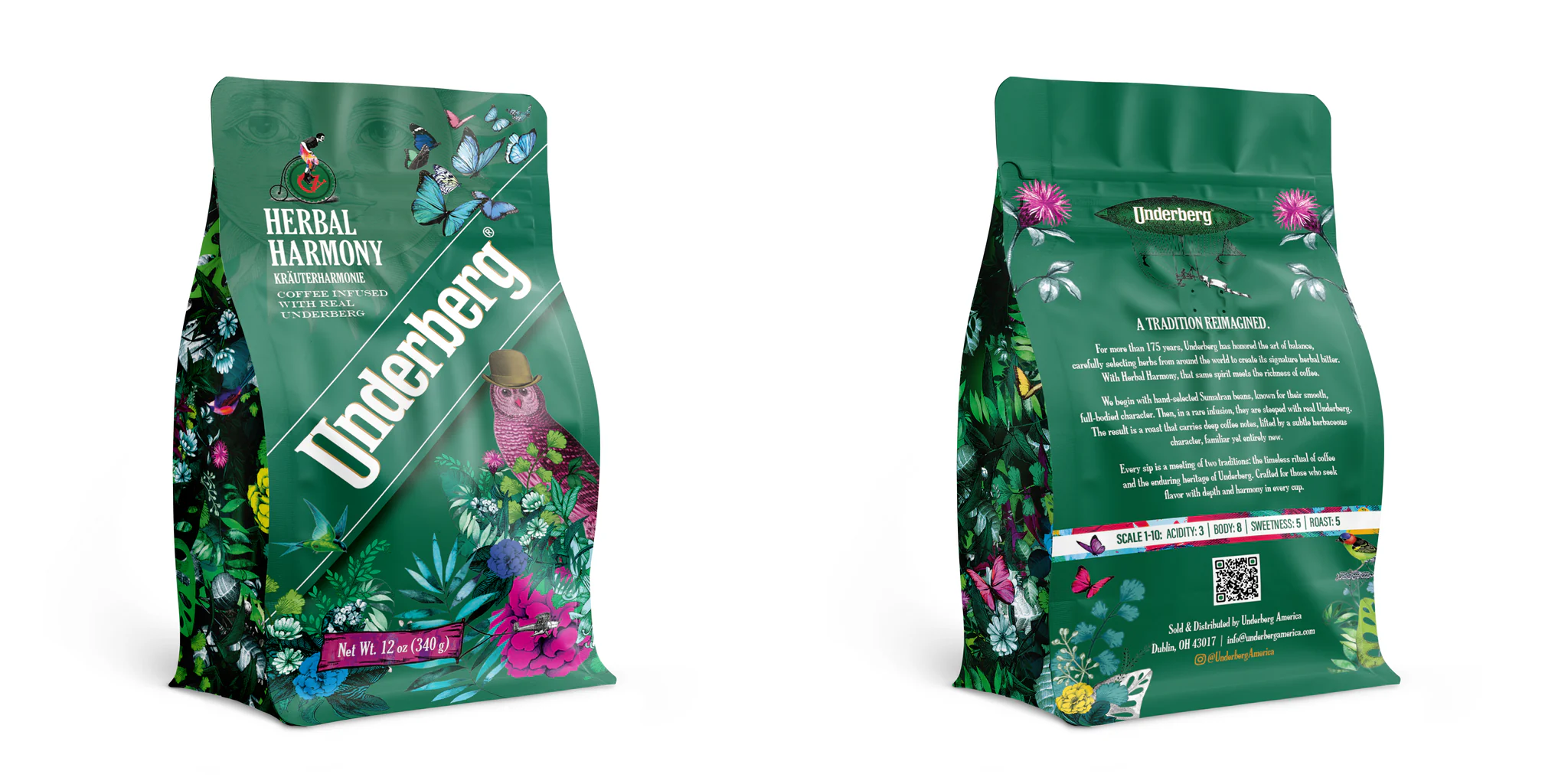 The key reference was Underberg’s new “Pop Art Meets Tradition” brand world, created for the 175th anniversary. We drew from its mysterious herbal flora, iconic Underberg green, and graphic pop-art/abstract elements to build a “magic world of herbs” on the coffee bag—anchoring the design in heritage while pushing it confidently into a new category.