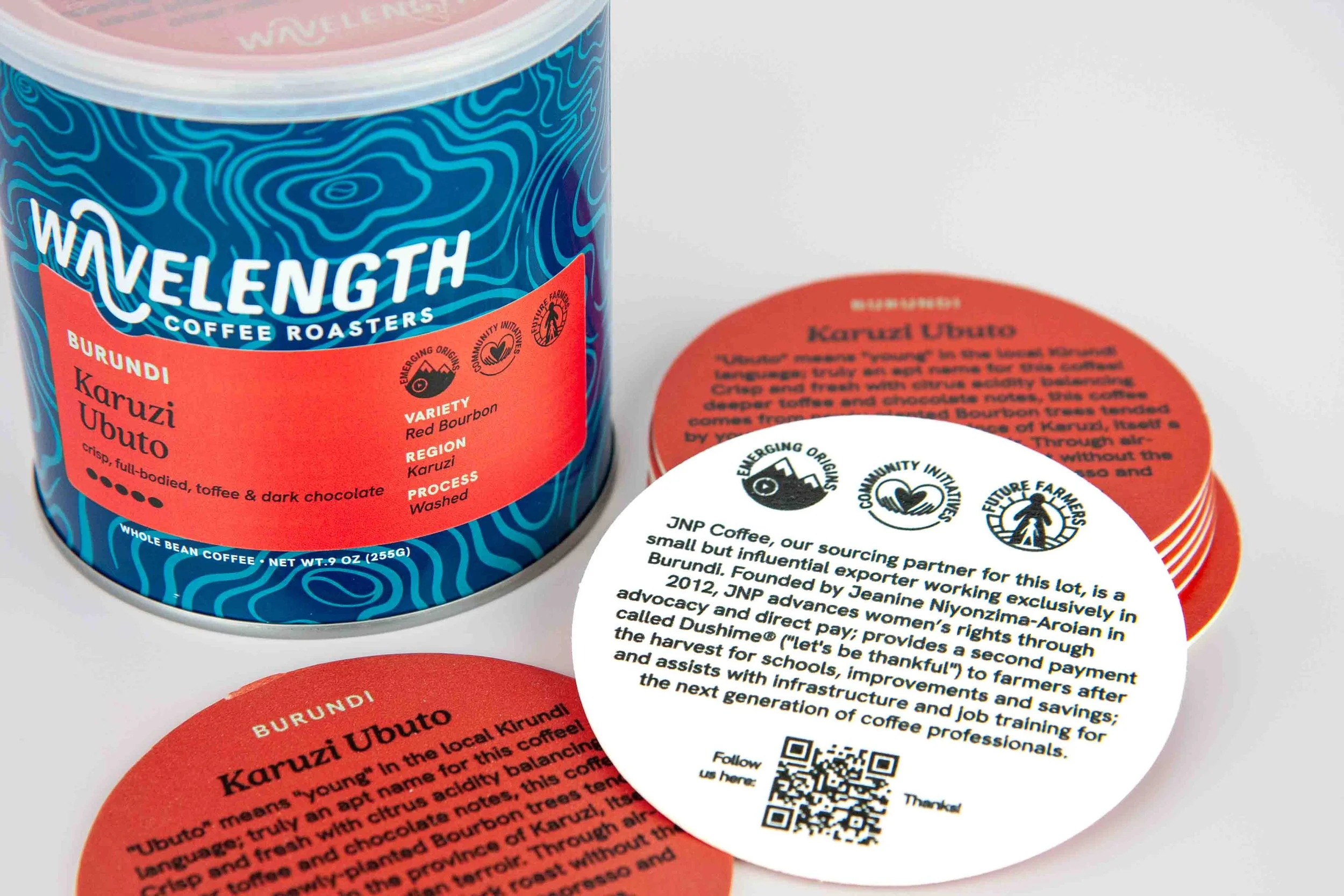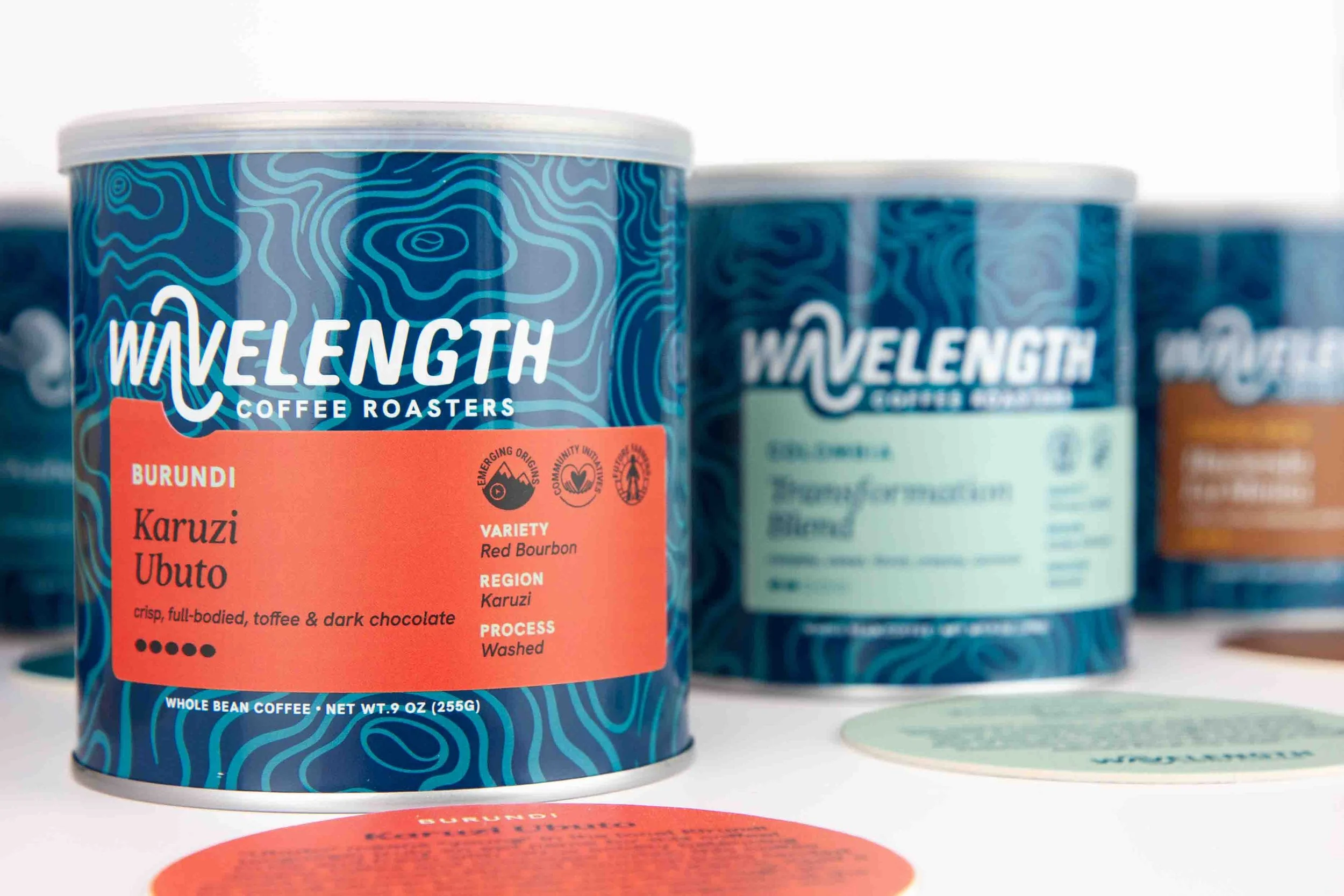 The swirling pattern wrapping the can references ripples in water and topographical maps - nodding to the natural elements inherent in coffee production as well as our company name, Wavelength, which implies alignment and connection.